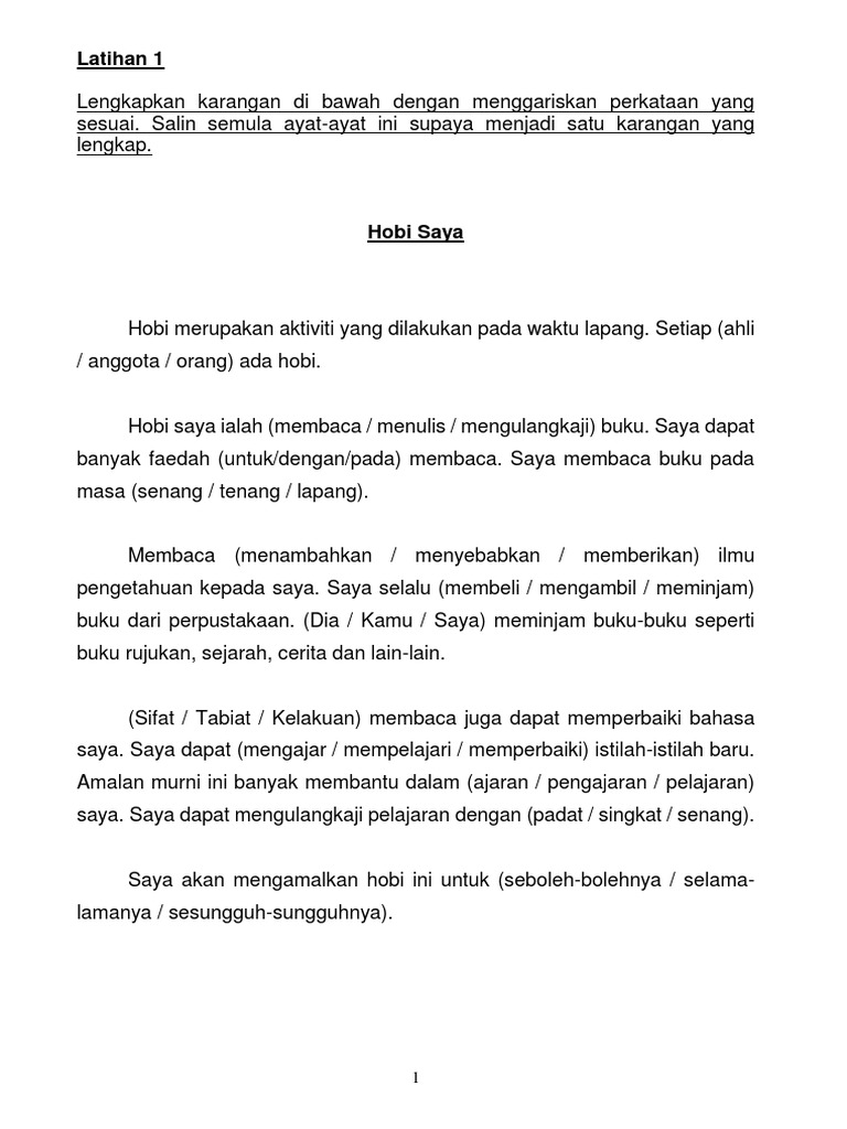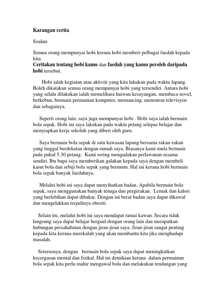 Nov 08 2020 Menurut Kamus Dewan Edisi Kedua hobi ditakrifkan sebagai aktiviti kegemaran yang dilakukan seseorang pada waktu lapang. Selepas menyiapkan kerja sekolah yang diberi oleh guru saya akan bermain bola bersama-sama rakan di padang permainan berhampiran rumah kami. Tulis sebuah karangan yang bertajuk Kegemaran Saya.